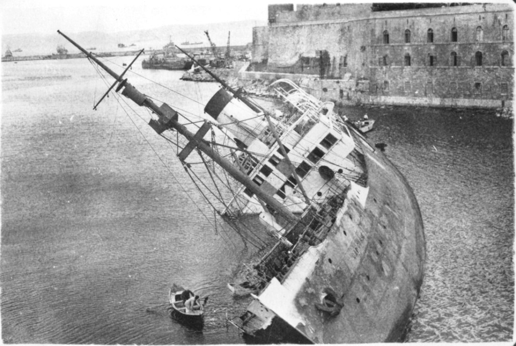 I came across the image above from another blog site, Inch High Guy, where the ship is identified as the Cap Corse. Subsequently, I found other photos of the same ship from different angles to confirm the sunken ship’s resting place before it was cleared away. Below is one such photo of the same ship, but looking from the other side of the channel.
